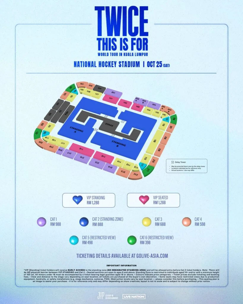 After announcing their long awaited return to Malaysia, K-pop sensations TWICE finally unveiled ticketing details and the seating plan for their upcoming “This Is For” concert at National Hockey Stadium, Kuala Lumpur. The concert will take place on 25th October 2025 (Saturday). The Live Nation pre-sale will open on 18th September 2025 (Thursday) at 11am, while the general sale will be available from 19th September 2025 (Friday), 11am onwards. The ticketing details and seating plan are as follows: