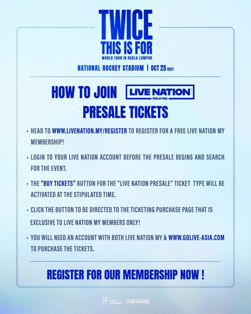 This upcoming concert marks TWICE’s long-awaited return to Malaysia. The last time the girl group performed in KL was in 2019 for their “TWICELIGHTS” World Tour at Axiata Arena. Local ONCEs (TWICE fans) have been eagerly waiting for the group’s return, hoping to see them perform on our shores again. Earlier this week, Live Nation Malaysia teased a TWICE concert in Malaysia, sparking tons of interest.
