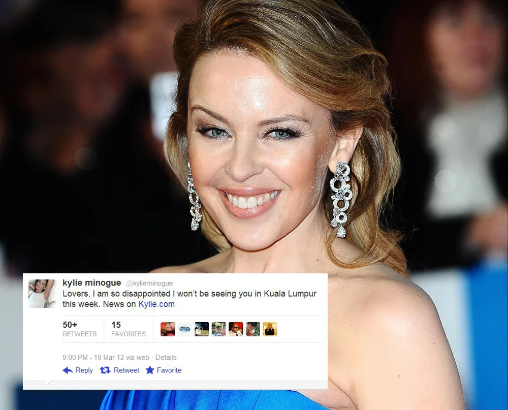 We know that you know by now – Kylie Minogue will not take centrestage in Kuala Lumpur this weekend after all in conjunction with the Petronas Malaysian Grand Prix. A source claimed, “Kylie comes with an entourage of 80 people. We asked the F1 Rocks people to get more sponsors, but they failed to. So we cancelled the deal.”