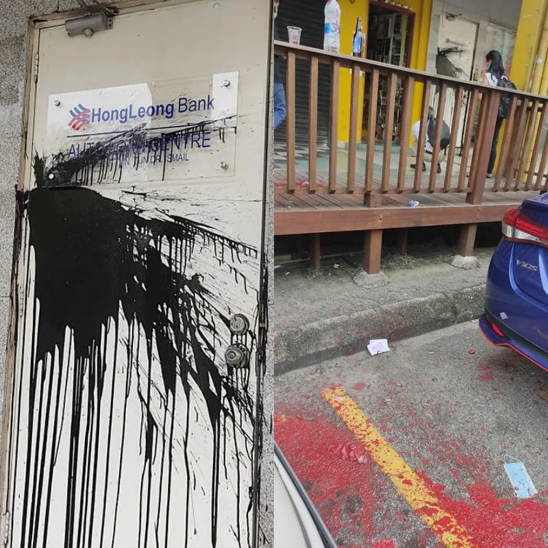 According to TheVibes, an employee of the Hong Leong Bank outlet located right next to the ground floor staircase entrance of Crackhouse, showed that parts of the bank have been splashed with black paint possibly meant for the comedy club but missed by a hair.
