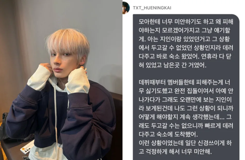 Normally, when an idol is caught up in a dating rumour, their label would be the one to issue an official statement. However, Hueningkai took matters into his own hands and directly addressed the photos that had been circulating. For context, the TXT maknae was reportedly spotted with an unidentified woman alone on the street at night. Some speculated that he was secretly dating, while others suggested that the woman might have been one of his sisters.