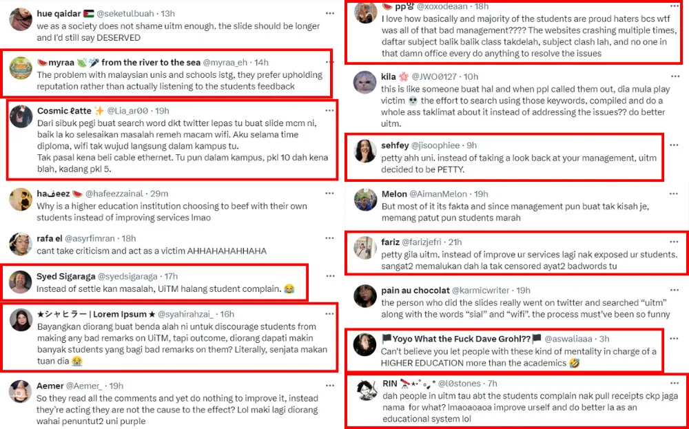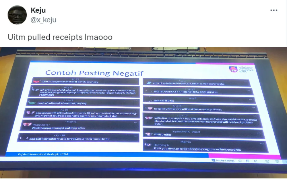 It’s unclear where the presentation took place or the context of the slide. However, it appears UiTM had publicised the tweets to discourage current students from making negative remarks about the university. It’s also worth noting that tweets shown include vulgar language. Nevertheless, the tweet unsurprisingly raised even more dissatisfaction towards the university, with netizens calling the institution out for publicly shaming students.