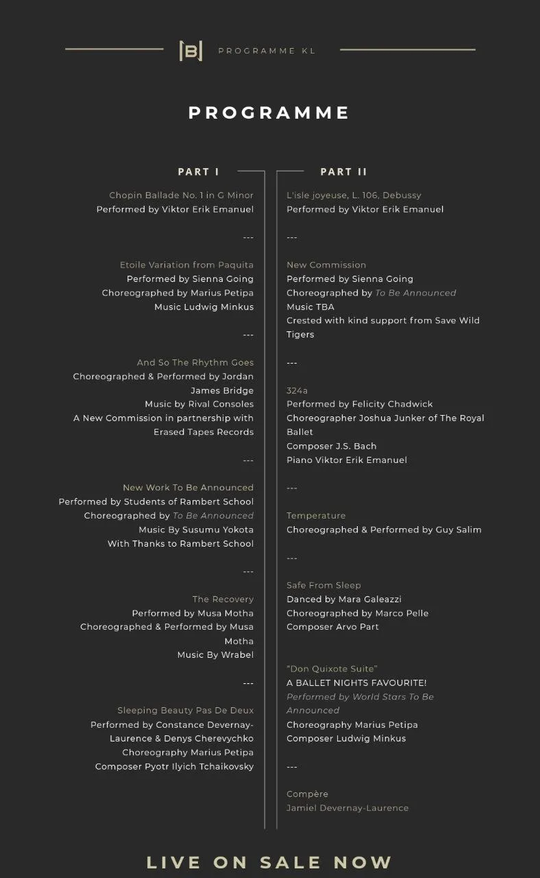- Ticketing: RM199 (Markova), RM299 (Copeland), RM399 (Guilem), RM499 (Nijinsky), RM599 (Nureyev), RM699 (Fonteyn), RM799 (Pavlova), RM899 (VIP)