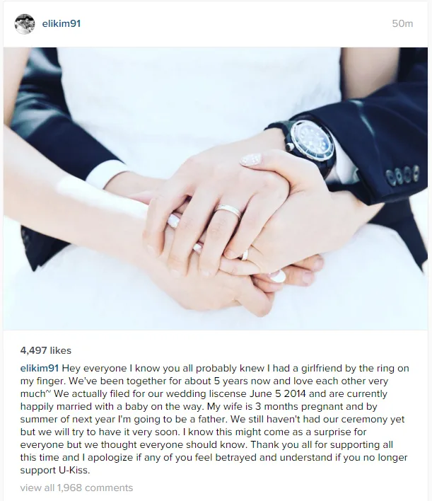 Meanwhile, U-KISS’ agency NH EMG has released an official statement regarding the above news. According to their statement, Eli did not notify them of his marriage to his wife, a model who is 11 years his senior, until October 2014. This was due to the fact that Eli was worried about the news negatively affecting the agency as well as his fellow U-KISS members.