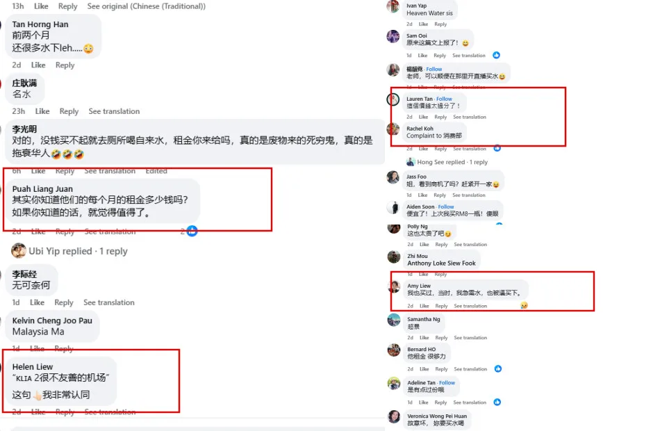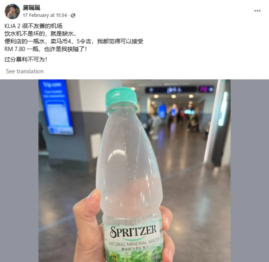 Earlier this week, local TV host Chiong Pei Pei (蔣珮珮) posted a photo of a Spritzer mineral water bottle she purchased at KLIA Terminal 2. Much to her dismay, the item cost RM7.80. “KLIA 2 is a very unfriendly airport. The water dispensers are either broken or out of water. I can accept a bottle of water being sold for RM4 – RM5 at convenience stores, but RM7.80 per bottle? Maybe I’m just being narrow-minded, but such excessive profiteering is unacceptable!” she wrote.