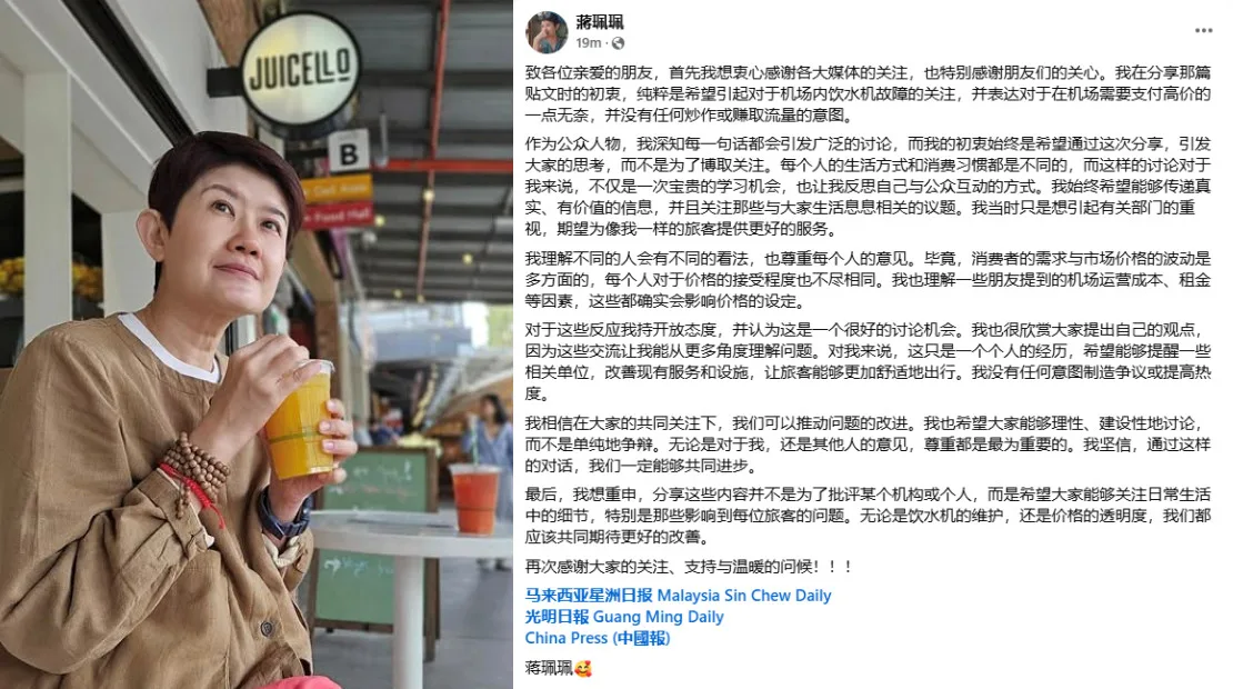 While KLIA has yet to respond to the comments, Chiong Pei Pei posted on Facebook earlier today (Wednesday, 19th February) to address her viral post. She clarified that her intention was to draw attention to the broken water dispensers at the airport while also expressing her frustration about having to resort to buying the expensive item there. That being said, the presenter is glad to know that her post has opened up discussion, as it could help improve things.