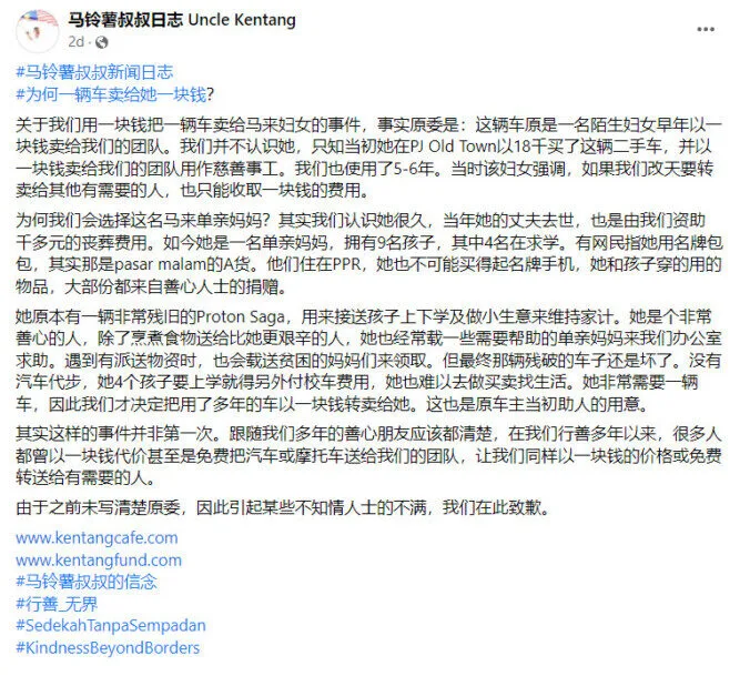 However, recently, Mr. Kuan’s charity upset some as they felt it was undeserved. Apparently, he sold a second-hand car for RM1 to a woman. Netizens noted she had an expensive iPhone and a branded bag. So, on 28th February, Mr. Kuan took to Facebook to justify his actions.