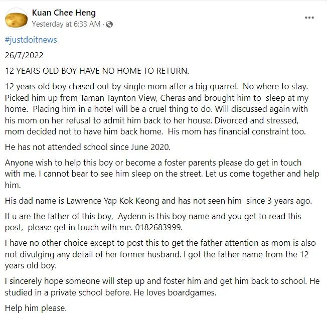 On Tuesday (26th July), Mr. Kuan uploaded a Facebook post detailing the story of a boy that was kicked out of his house. Apparently, he had a misunderstanding with his mother. This led to her being unwilling to allow her son, Aydenn, to come home. Instead, she requested Mr. Kuan to take care of him.