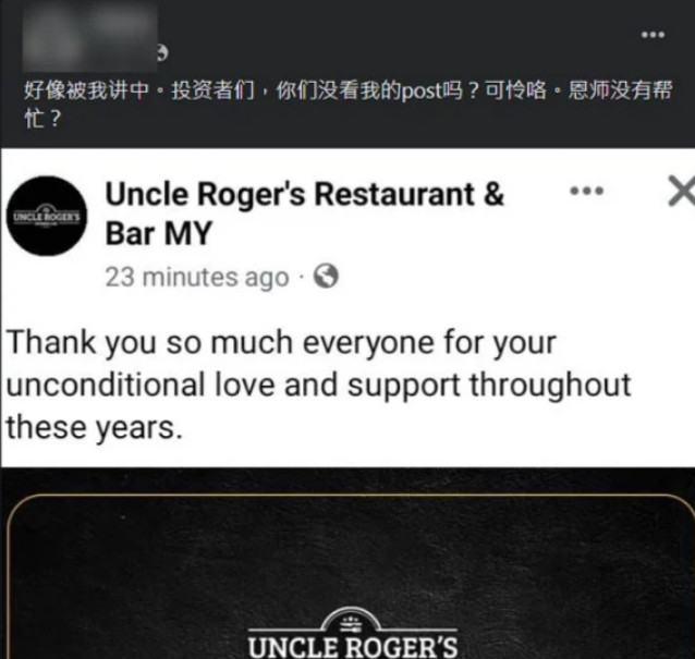 Recently, someone shared on Facebook a ‘farewell’ post from Uncle Roger’s Restaurant and Bar MY. “Thank you so much everyone for your love and support throughout these years.”