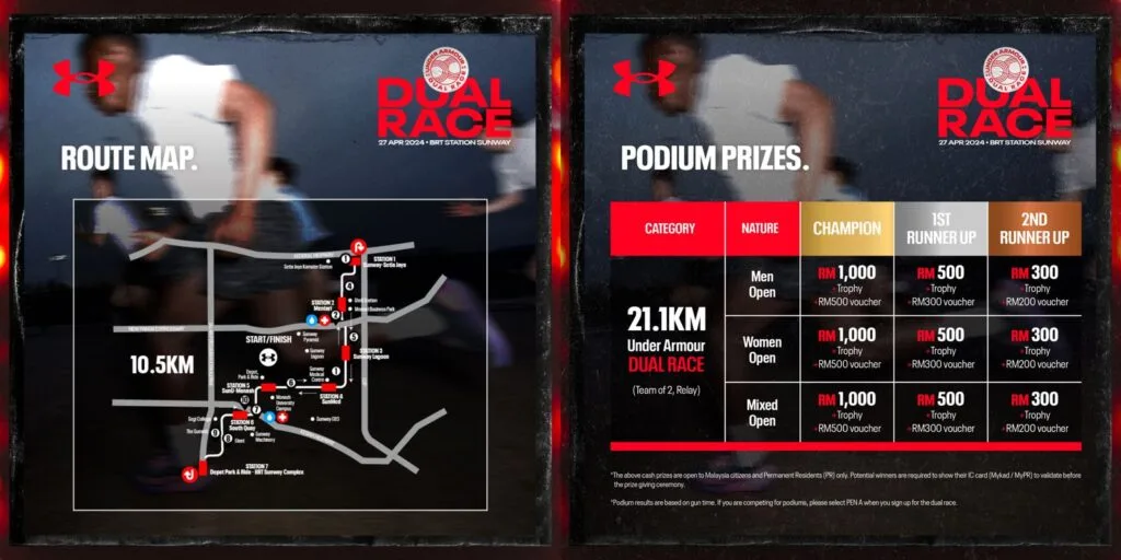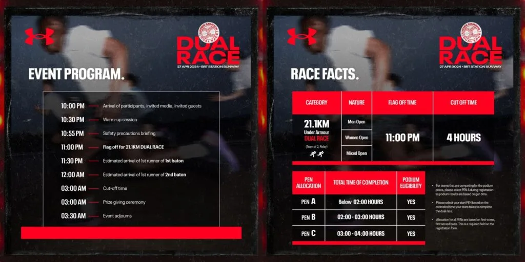 The UA Dual Race is set to be held on Saturday, 27th April 2024, starting at 11.00pm at BRT Station Sunway. Each team will tackle a challenging 21.1km course, aiming for personal bests.