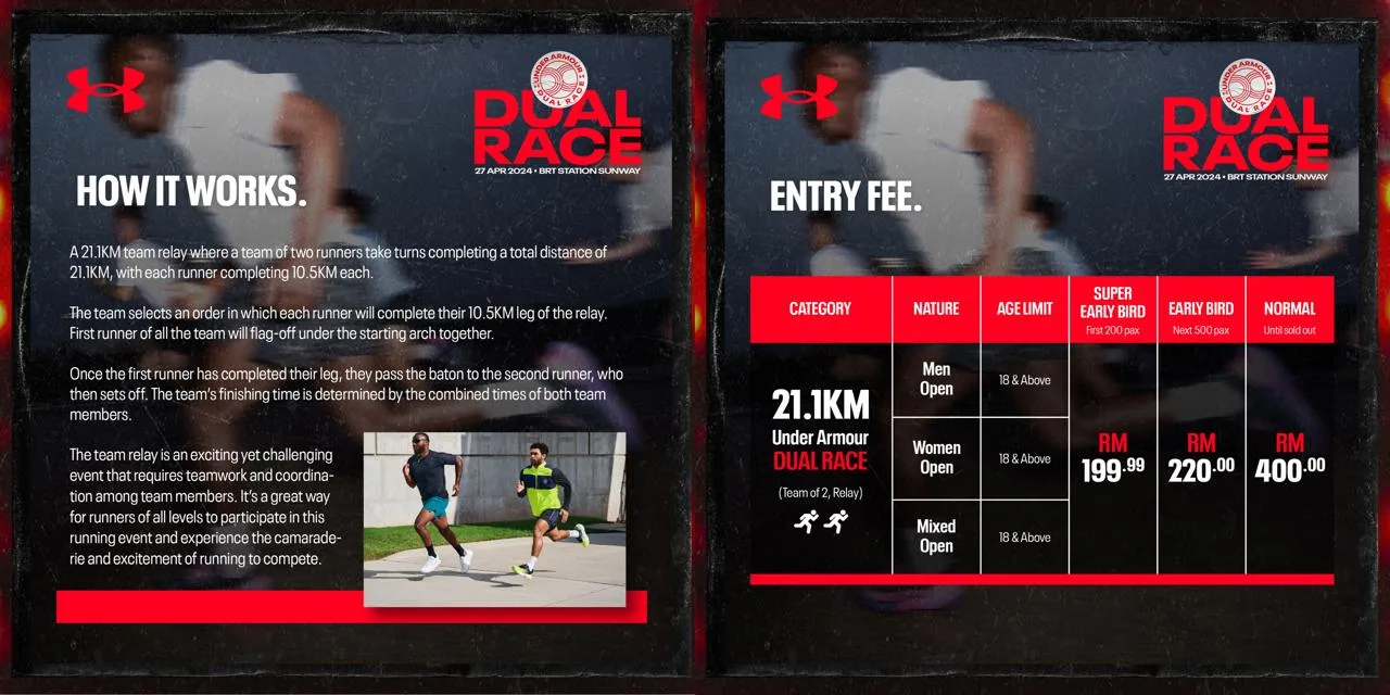 Individuals must be aged 18 and above to qualify for entry into the UA Dual Race, which features three categories: Male Open, Female Open, and Mixed Open. Registration for the UA Dual Race is now open. The first 200 pax to sign up for the Super Early Bird rate, will be entitled to the special price of RM199.99. When the Super Early Bird capacity has been reached, registrants can participate in the UA Dual Race for RM220 at the Early Bird rate limited to 500 pax. Lastly, the Normal rate stands at RM400 and will be available until the competition slots have been filled. Registration will close at 11:59pm on 25th April 2024.