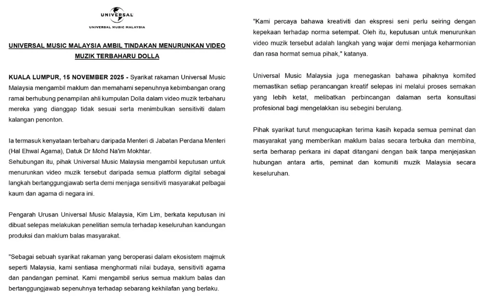 In its statement, UMM said it decided to remove the music video from all digital platforms as a responsible step to preserve the sensitivities of Malaysia’s diverse communities and religions. Managing director Kim Lim said the decision was made after conducting a thorough review of the content and the feedback received from the public, adding that taking down the music video is a reasonable step to preserve harmony and mutual respect among all parties.