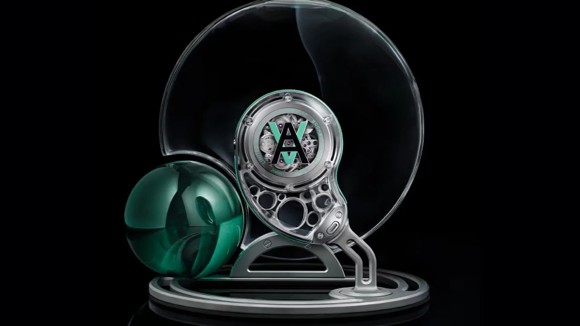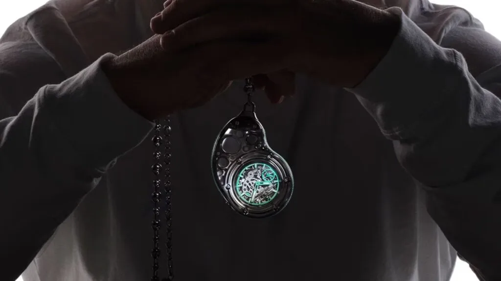 The watch can be worn as a necklace, a standard pocket watch, or even displayed as a sculptural centrepiece on its decorative titanium and mineral glass table stand.