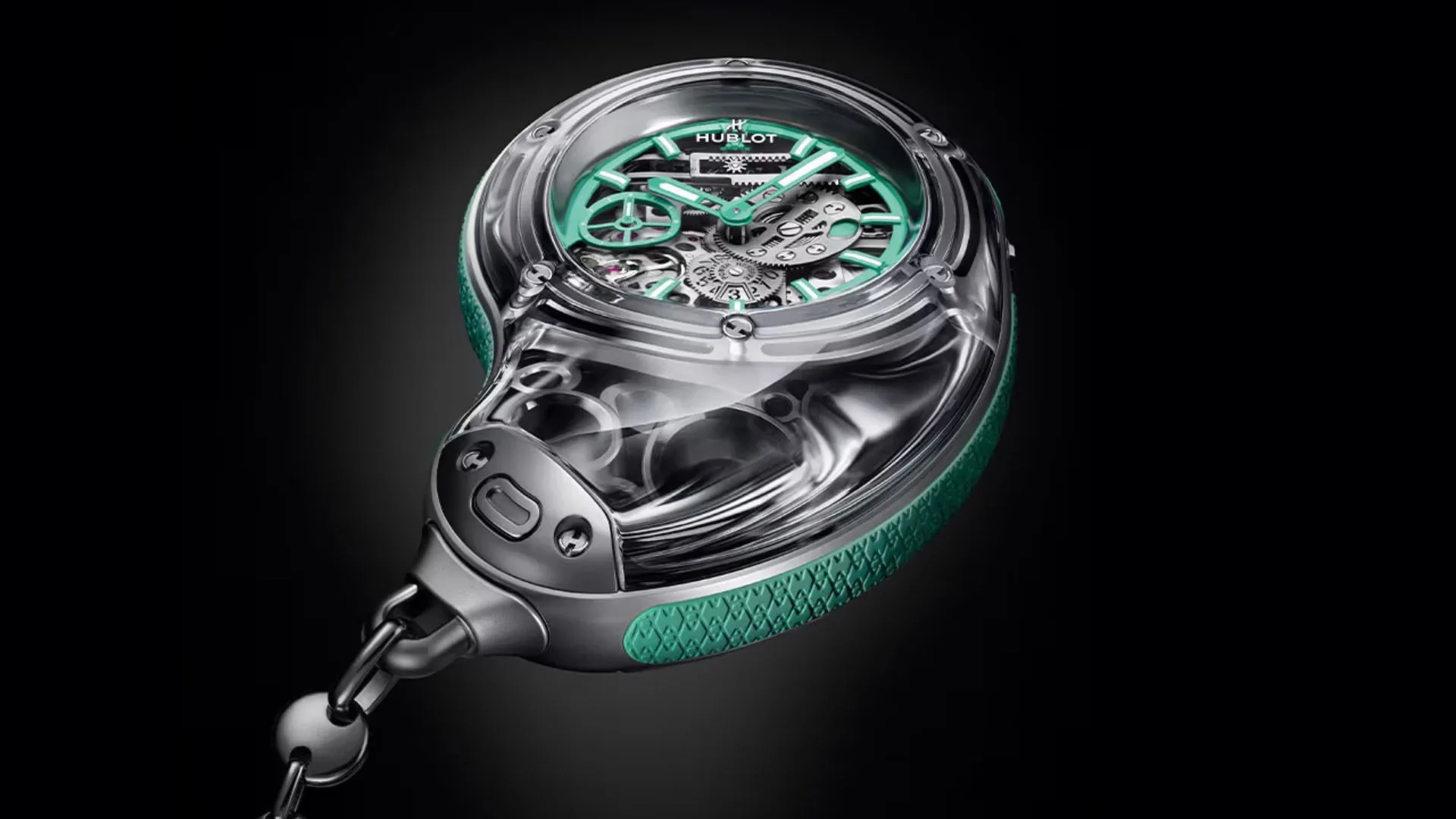 The Droplet is a completely new take on the traditional pocket watch. The design is inspired by water’s fluidity, and it embodies rounded elegance and transparency. The Droplet’s bold design incorporates a titanium case, sapphire crystal, and rubber bumpers, as well as a distinct rounded drop shape and unparalleled complexity.