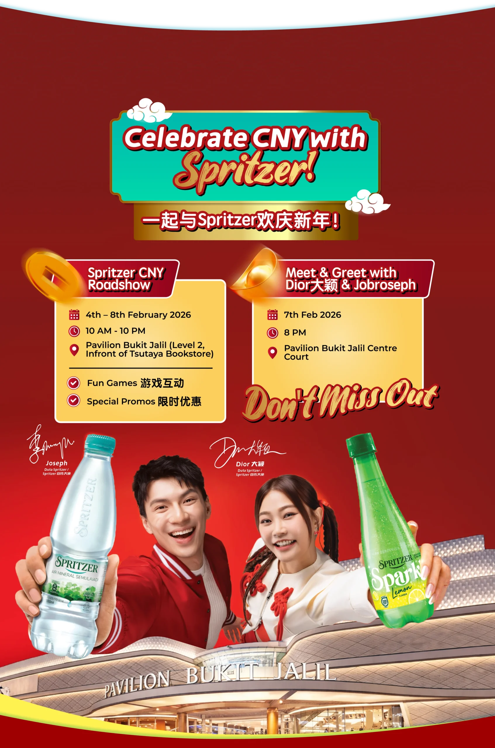 Spritzer brings these moments to life with its interactive Chinese New Year roadshow happening from 4th to 8th February 2026 at Level 2, Pavilion Bukit Jalil (in front of Tatsuya Books Malaysia). Visitors can enjoy a Meet & Greet with Dior and Joseph Lee (Jobroseph), interactive game booths, exclusive promotions, and product sampling, creating a lively space for families and friends to celebrate together.