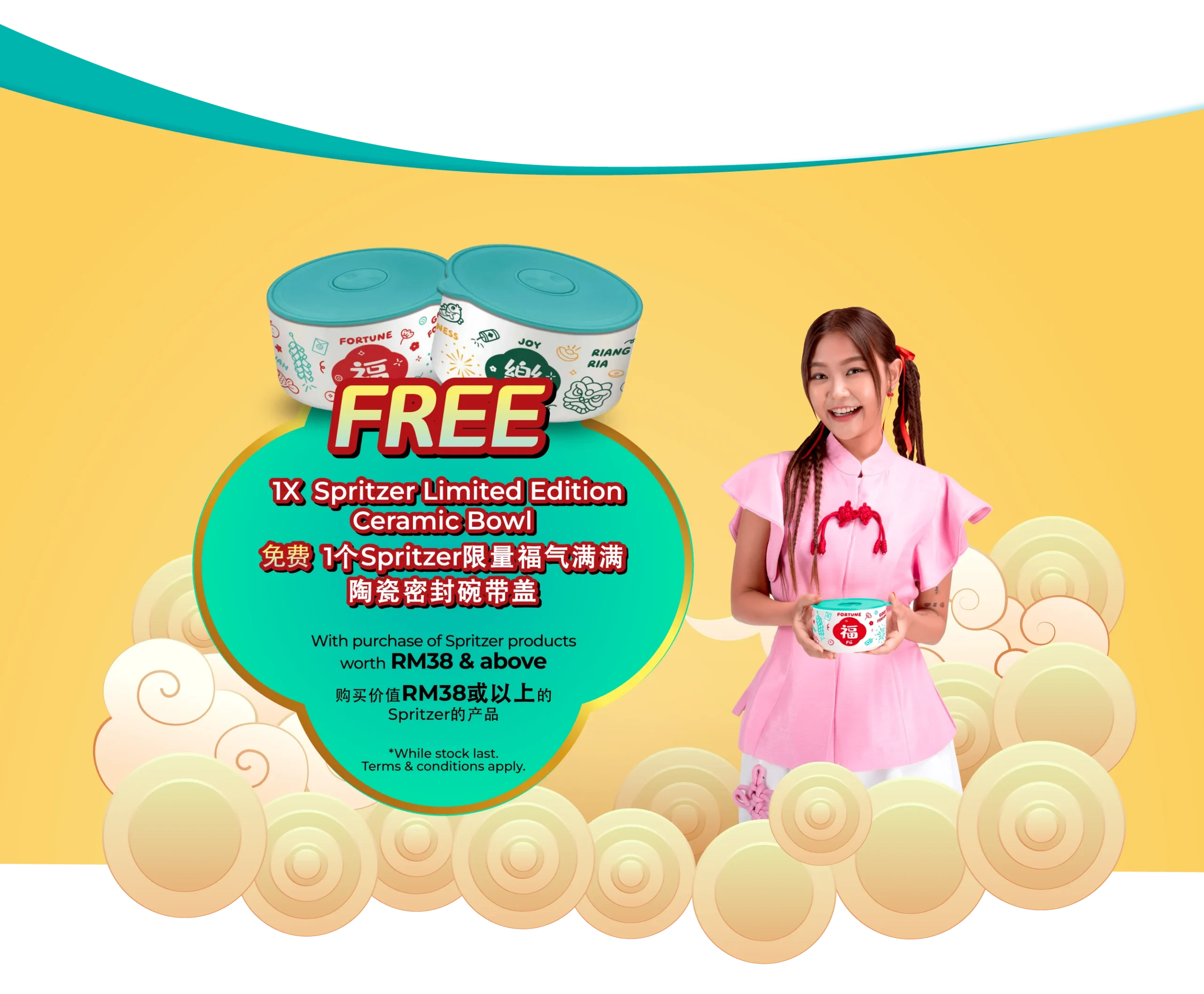 - Purchase RM38 worth of Spritzer products and receive a limited-edition Spritzer Chinese New Year bowl with lid (available at selected outlets with promoter sampling);
