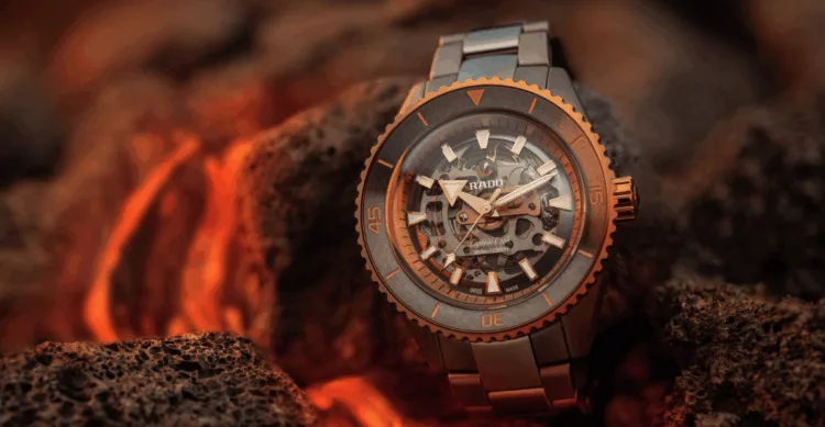 In the heart of a fiery, ever-dramatic landscape, the latest addition to Rado’s Captain Cook collection has emerged, setting the stage ablaze with a daring new skeleton design. This avant-garde timepiece features the innovative R808 movement, a marvel of contrasts, technical prowess, and clever geometry.