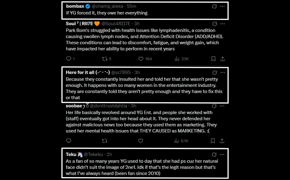 Fans recalled previous accounts in which 2NE1 members spoke candidly about their experiences, particularly remarks made by YG founder Yang Hyun Suk regarding their appearances. CL (씨엘) once revealed that during a rehearsal without makeup, the CEO referred to the group as “really ugly” in front of staff, and even suggested that she undergo plastic surgery prior to debut. Many fans have since viewed such incidents as examples of the harsh criticism the members endured early in their careers.