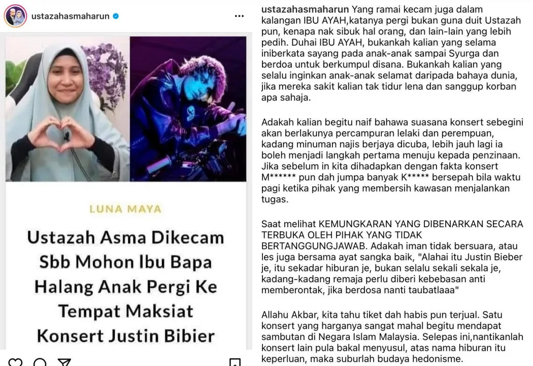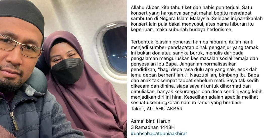 “Among the many people who criticised me include parents. The hurtful comments I received include, ‘We didn’t even ask for your money (to purchase the tickets). Why do you want to poke your nose into other people’s affairs?'” Asma’ revealed in her post. “Are you being so naïve with the fact that the atmosphere of the concert itself might lead to promiscuity? In some cases, some even consume alcoholic drinks. Worse, it can also lead to other problems including adultery.”