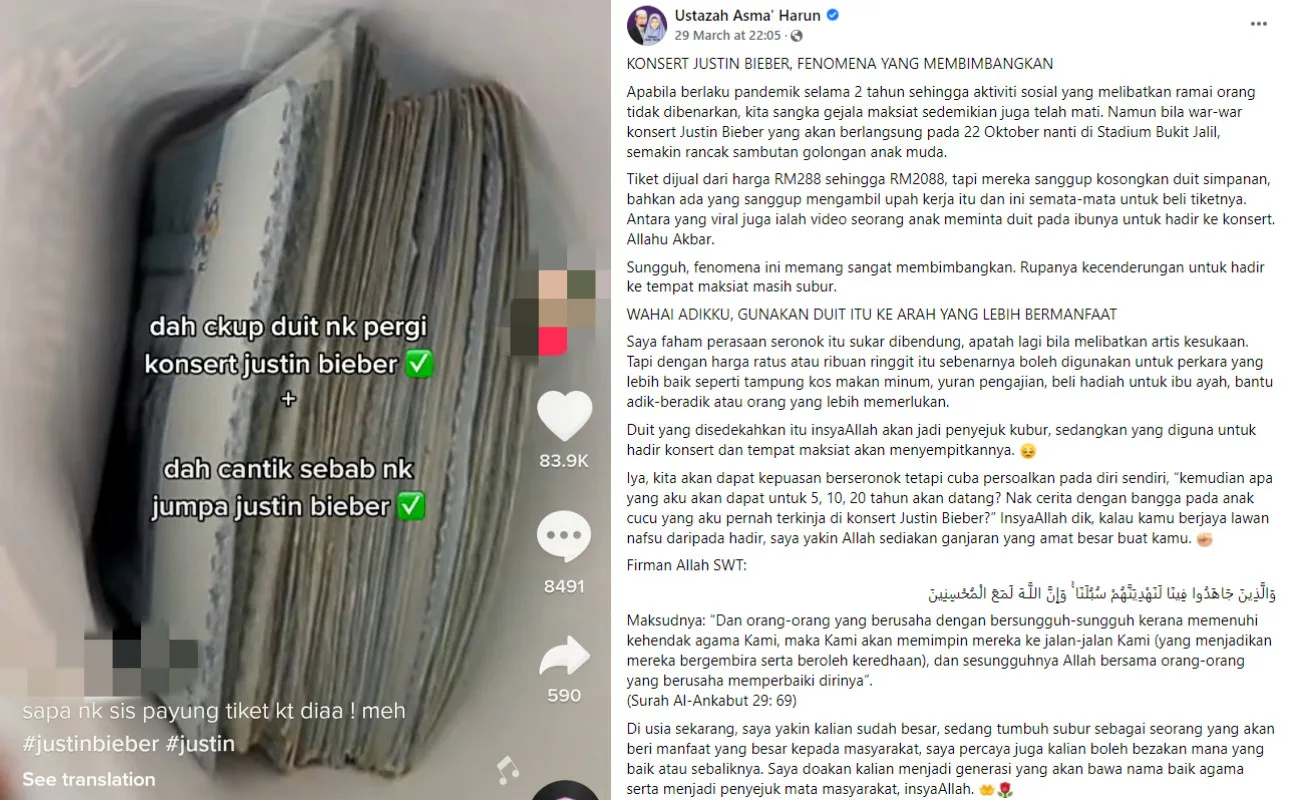 Ustazah Asma’ wrote on her Facebook, “When our country was struck with the pandemic, all social related activities were not allowed by the government. Just when I thought that all these immoral omens have died down, it was announced that Justin Bieber will be having his concert on 22nd October at Bukit Jalil (National) Stadium. The news was met with huge reactions from youngsters.”