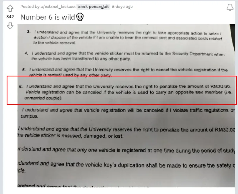 The rule stated, “I understand and agree that the university reserves the right to impose a penalty amount of RM30. Registration can be cancelled if the vehicle is used to carry an opposite sex member (i.e unmarried couple)”. If you’re wondering which educational institute this is, the OP claimed that they are a student at University Utara Malaysia (UUM) in Sintok, Kedah.