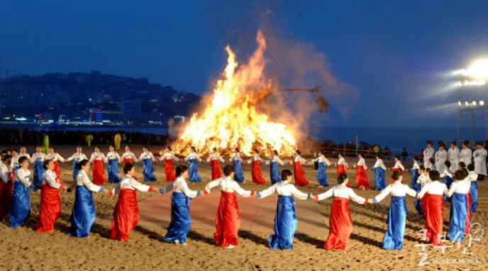 The Dalmaji Festival draws some 200,000 to 300,000 moon watchers on each year’s first full moon day (usually around 15th January). They gather and pray for their wishes, watching the full moon rise over Haeundae Beach. The festival consists of a variety of games including kite-flying, nol twigi (seesawing), farmer’s music, traditional mask dance, and other customs. “Feeding the Dragon King” ceremony takes place on Haeundae Beach where people contribute specially prepared rice cakes and fruits as an offering to the sea, hold candles in their hands, and pray for year-long peace and happiness. A grand feast reaches its climax by the burning Daljip (Full Moon House) as the full moon rises above the sea.