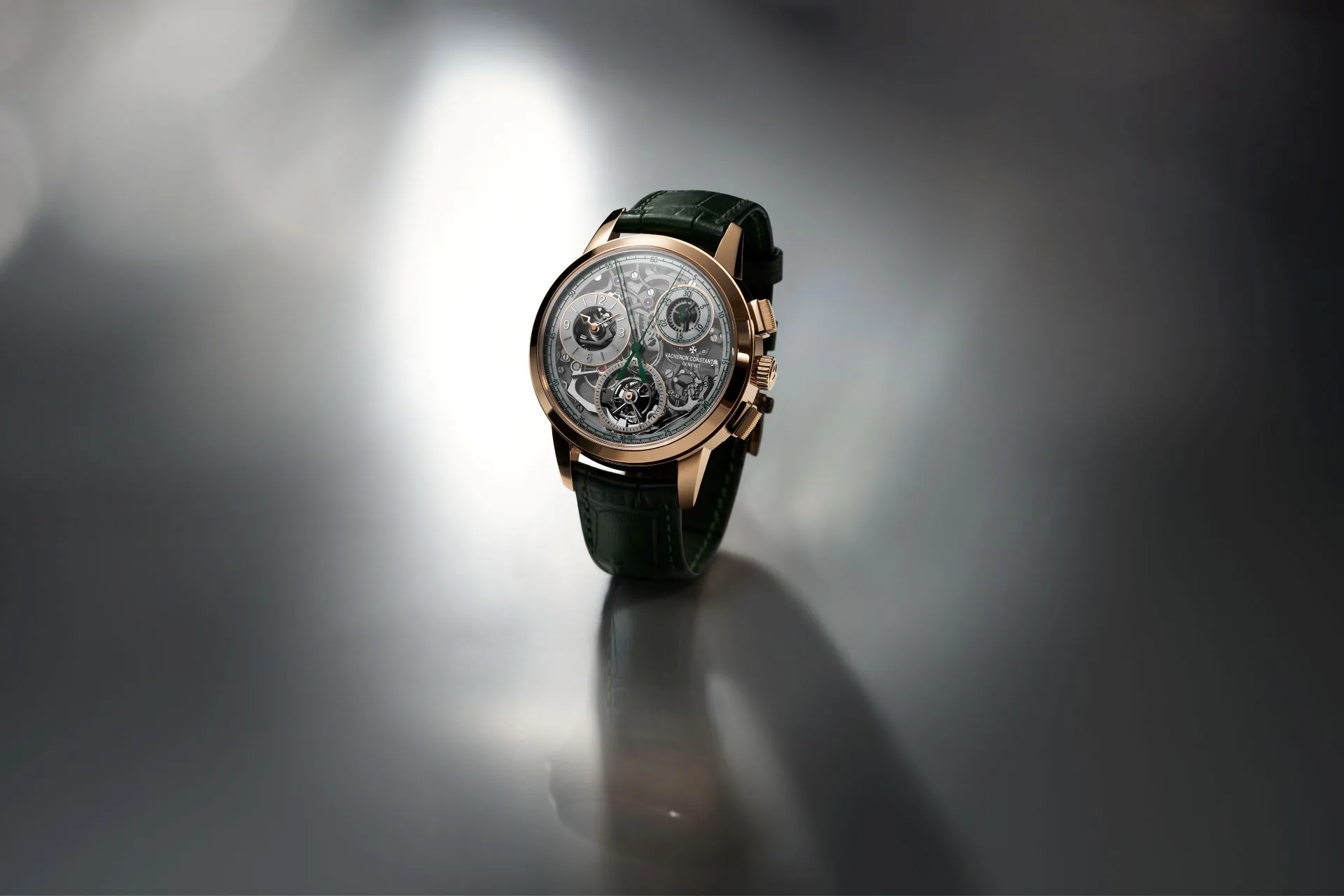Each component is painstakingly polished, chamfered, and decorated to Haute Horlogerie standards, with the open-face dial offering a clear view of the inner workings. From its green chronograph hands to its hand-stitched alligator strap, every detail is crafted with purpose and precision.