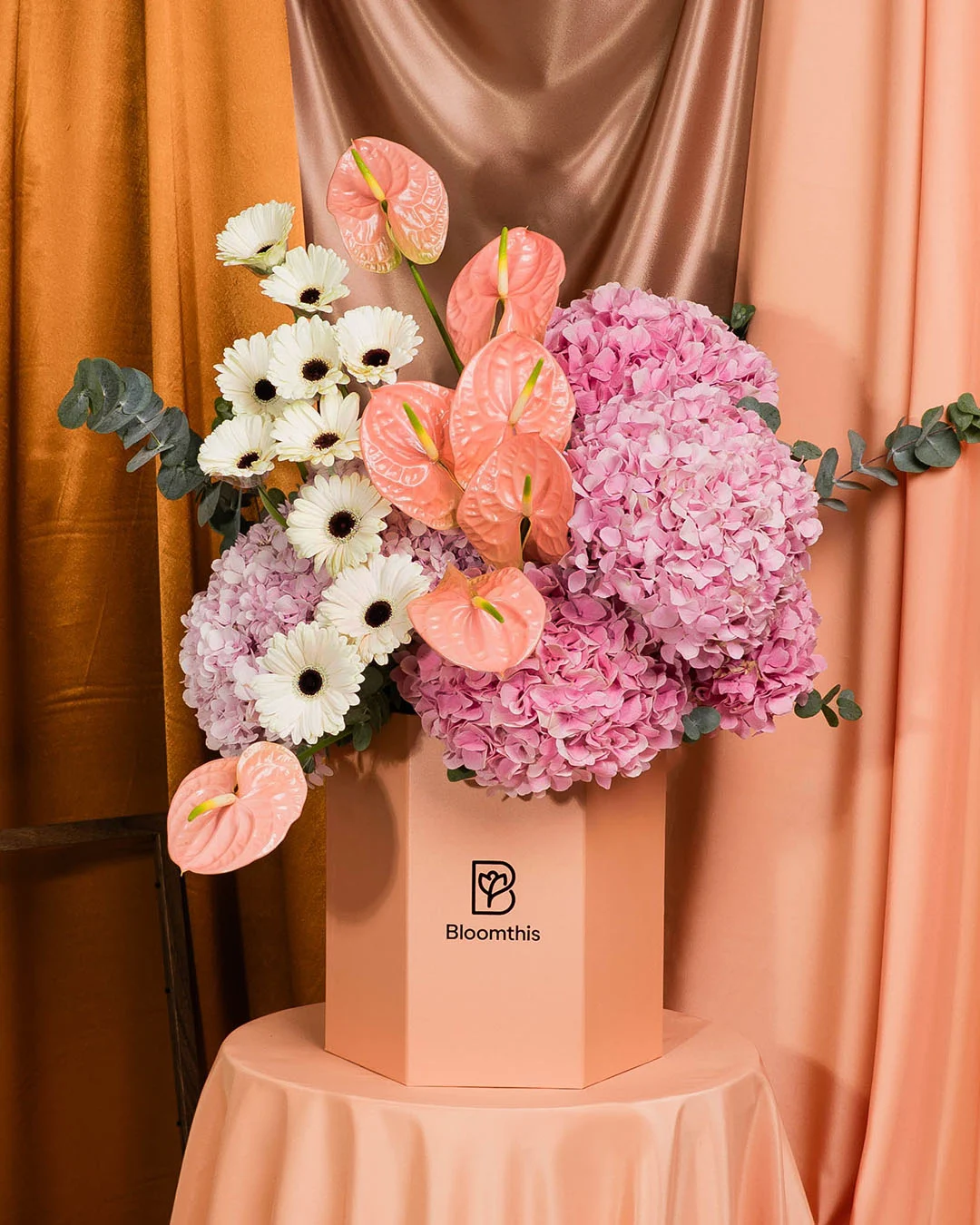 Billowy pink hydrangeas take centre stage in this lush arrangement, complemented by champagne gerberas and sleek anthuriums. The overall effect is light, joyful and comforting, making it a beautiful choice for expressing warmth and affection.