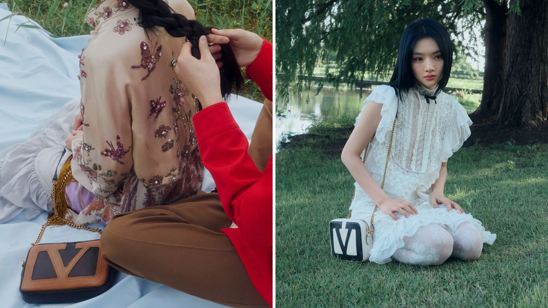 The two protagonists wear looks from Valentino Fall 2025 collection and Valentino Garavani accessories, including the Nellcôte and Viva Superstar bags.