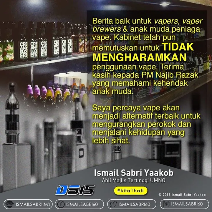 Translation: Good news for vapers, vape brewers, and vape salesmen. Today, the Cabinet has decided not to ban vaping. Thank you to the Prime Minister and Government who understands the aspirations of the youth. I believe that vaping is the best alternative to discourage smokers from smoking and to live a healthier lifestyle.