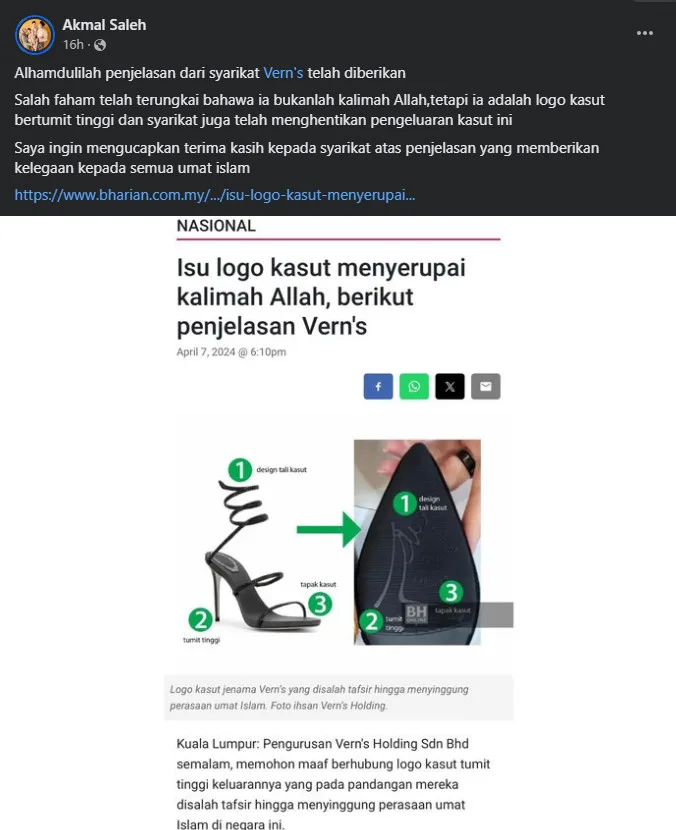 UMNO Youth Chief, Dr. Muhamad Akmal Salleh expressed his gratitude after receiving a proper statement from Vern’s Holding Sdn Bhd. The UMNO representative stated in a Facebook post, “I would like to thank the company for their explanation. This has provided relief to all Muslims”. He clarified that Vern’s statement is reasonable and praised the company’s professionalism in understanding the sensitivity within Muslim communities.