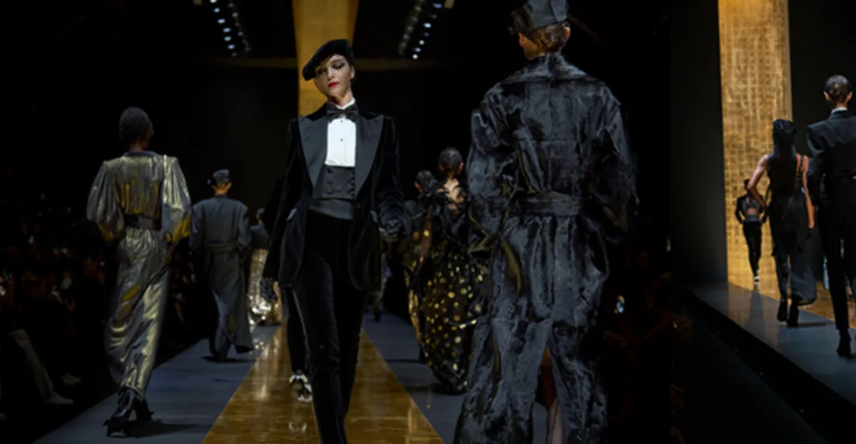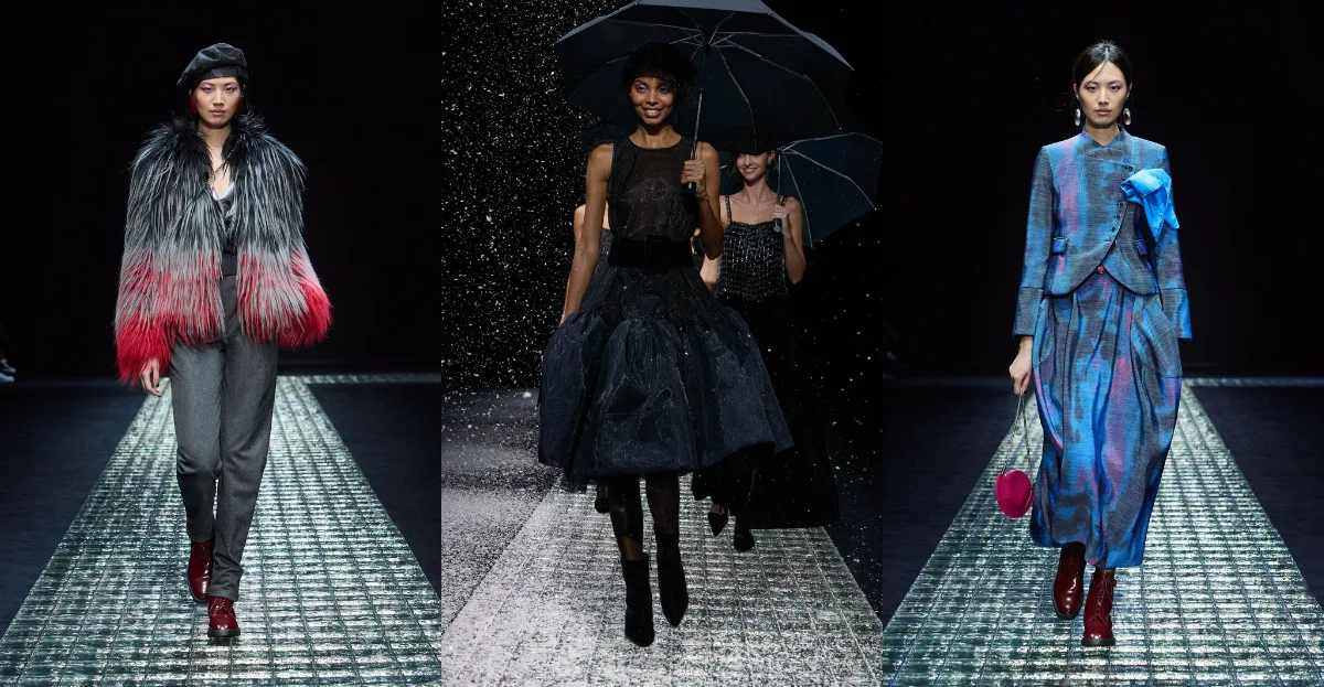 Experience the mesmerizing world of Emporio Armani’s latest collection, inspired by the celestial wonders of the night sky. With a palette as vibrant as the cosmos, the iconic Armani woman effortlessly blends trousers with billowing shirts and enveloping coats.