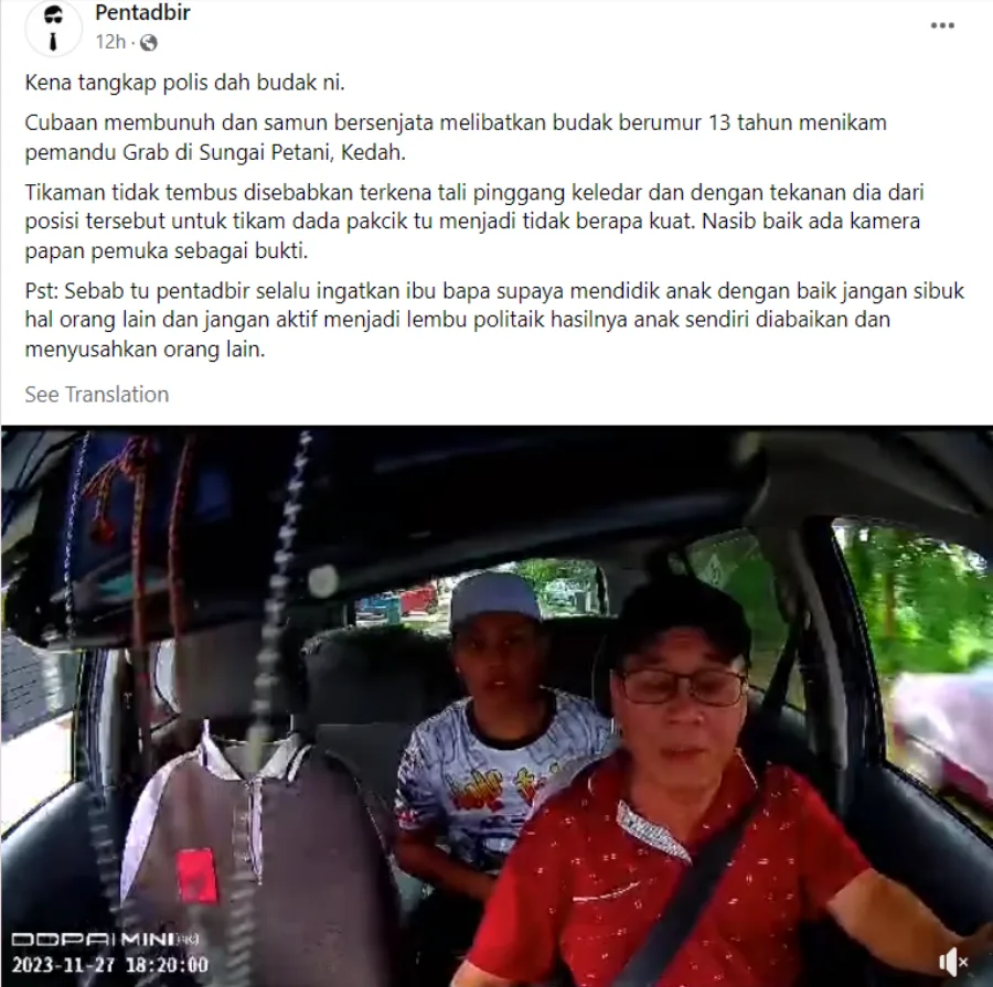 Officers have released a statement regarding the stabbing incident involving a 13-year-old boy and an elderly Grab driver. According to Assistant Commissioner Zaidy Che Hassan of the Kuala Muda District Police, the boy has been detained by the authorities following a report by the victim, confirming the previous claims by the victim’s daughter-in-law.