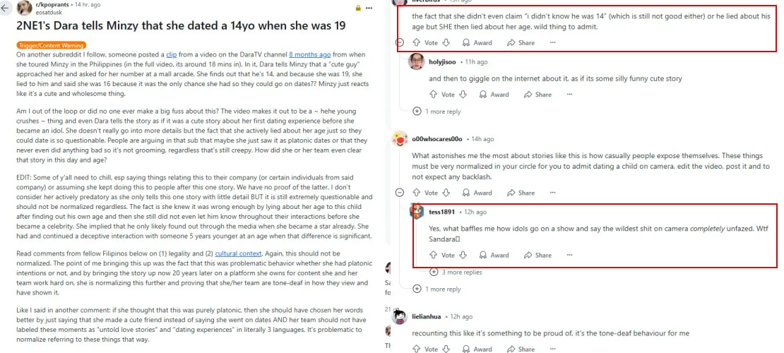 Many questioned her decision to share the story after all these years, while others questioned her team for keeping it in the video and allowing it to be published. A few defended Dara saying that she was still young so she may not have been aware of what she did. Others provided insights on the dating culture in the Philippines where the 2NE1 member grew up.