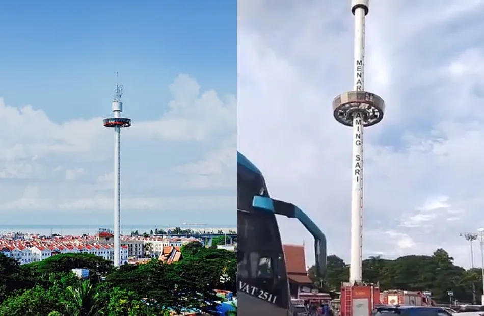 Yesterday (Sunday, 2nd July), it was reported that 36 visitors were stuck in the iconic revolving gyro tower in Bandar Hilir, Melaka, for about an hour. According to NST, it was said that the Taming Sari’s platform stopped moving halfway through its descent from the top, leaving the trapped tourist hanging 60-metres above the ground.