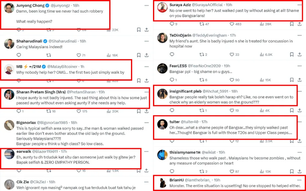 Netizens have shared their reactions to the news and CCTV footage. However, many criticised the lack of concern from two passersby towards the elderly woman. The two individuals had walked past the victim without approaching her while she sat injured by the road. Many netizens called the two selfish and heartless for not offering assistance, saying they’re just as bad as the perpetrator.
