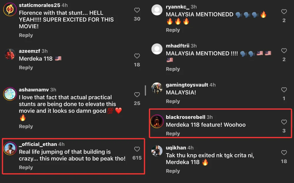 Fans from across the globe showed enthusiasm over Florence’s stunt, like Instagram user @/_official_ethan who commented, “Real life jumping off that building (Merdeka 118) is crazy… this movie about to be peak!”. Malaysian Marvel fans were also excited about the landmark cameo, with users like @/blackroserebell commenting, “Merdeka 118 feature! Woohoo”.