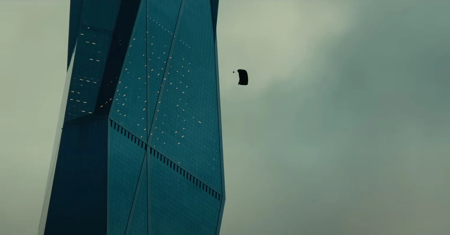 The scene then fades to Pugh’s pre-launch off the building with a harness as she cheekily comments, “How many times do you see someone throwing themselves off a building?”. With the countdown from the team, Pugh launches herself, chest first down the plunge down the Merdeka 118 tower and opens her parachute onto the coolest landing scene, with a straight face.