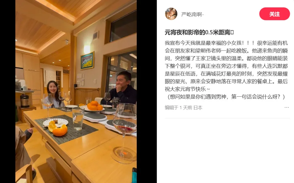 The actress shared about the meeting on her XiaoHongShu account, revealing that the two met in Japan through a mutual friend. It’s reported that Tony is currently in the country to enjoy a short vacation. Yan Yinan also had the opportunity to have dinner with the star and several other friends. She continued to gush about meeting the renowned actor, noting a specific interaction during the dinner.