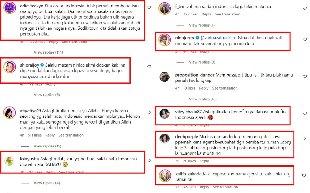 The star’s post received tons of attention from fellow celebrities and fans. Actress Sharifah Shahirah voiced her sympathy towards the celeb’s predicament and actress Nina Juren revealed she had experienced a similar case with her former maid. Many comments also urged Zarina to expose the maid agency, saying they might be complicit in the ordeal. Some Indonesians also criticised Rahayu’s action, saying it has brought shame to the country.