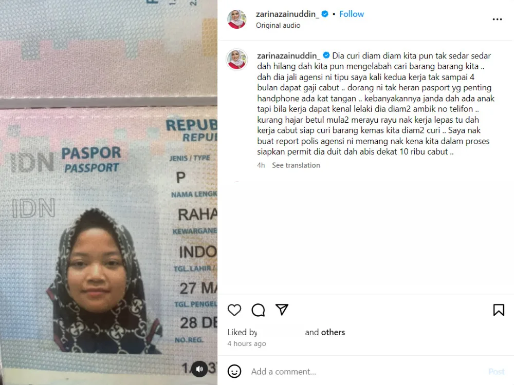 The maid left her passport at the actress’ home, but Zarina mocked the maid, saying she only needed her phone. The entrepreneur also claimed that she spent over RM10,000 on the application for Rahayu’s working permit, adding to her dissatisfaction. According to the “Seindah Cinta” star, this is the second time a maid has run away from her home. She said her previous maid, hired from the same maid agency, also ran away after a few months of working but didn’t mention the cause of the first instance.