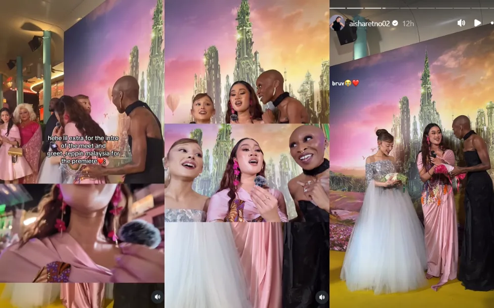 Upon meeting Ariana and Cynthia, Aisha introduced herself to them as the voice of Glinda in the Malaysian dub of “Wicked”, prompting a hug from Ariana. Cynthia also complimented the singer, saying she looked beautiful. It’s believed that the singer then invited the two stars to a quick rendition of “For Good” from the upcoming musical film.