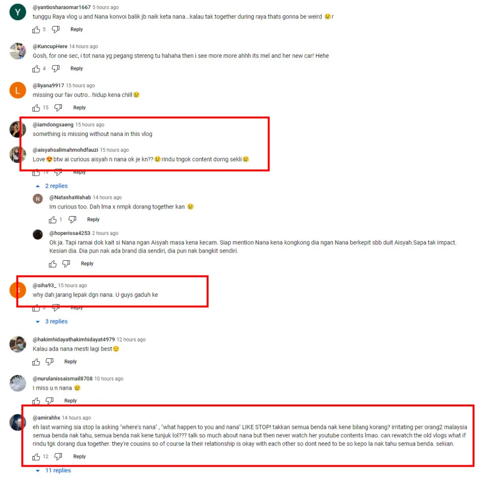 Looking to the comment sections of these new videos, fans seemed excited about the YouTuber’s return to making content. While most were happy about her being active again, others were curious about her friendship with influencer Eliya Farhana (fondly known as Nana). Many were wondering if she and Nana were still friends because they felt the videos lacked a certain element since the YouTuber used to feature her friends, especially Nana, in her videos.