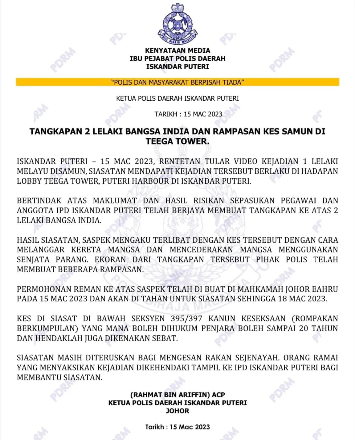 According to the statement released by the Iskandar Puteri District Police, the incident specifically took place in front of the Teega Tower and an arrest was made on the same day after a series of investigations. It was reported that the suspects will remain in custody until 18th March for further investigation. “The investigation will continue to find 3 other individuals believed to still be at large,” said Assistant Commissioner Rahmat Ariffin.