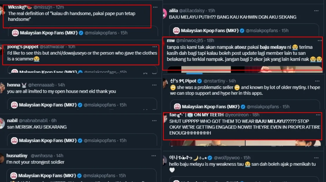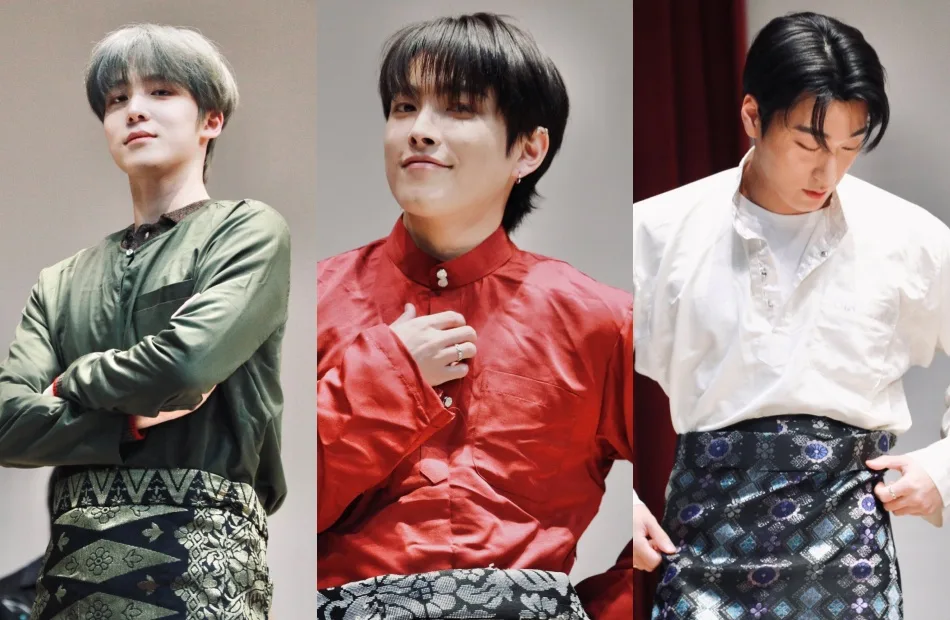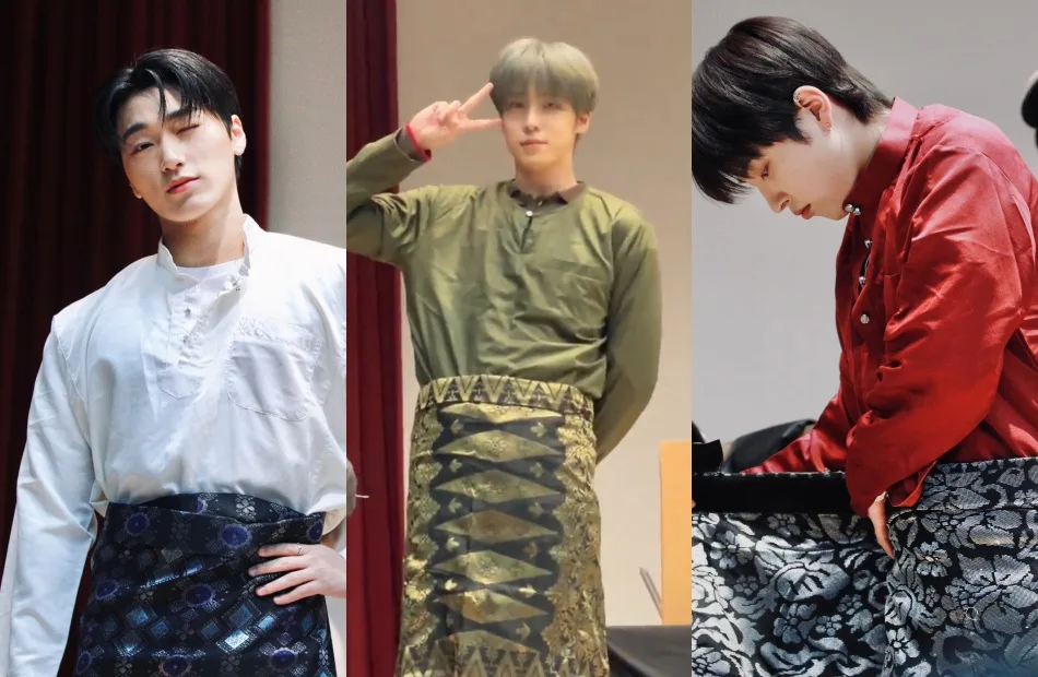 Three members — Hongjoong (홍중), San (산), and Yunho (윤호) — quickly put on the traditional Malaysian garments, and it was clear that the outfits were specifically from Malaysia, as one of the members was seen wearing a ‘teluk belanga’ design — a style popular in Johor. The staff members also helped the singers put on the sampin around their waist. The photos and videos posted by Korean fans quickly went viral among Malaysians, who were excited to see their idols in baju melayu.