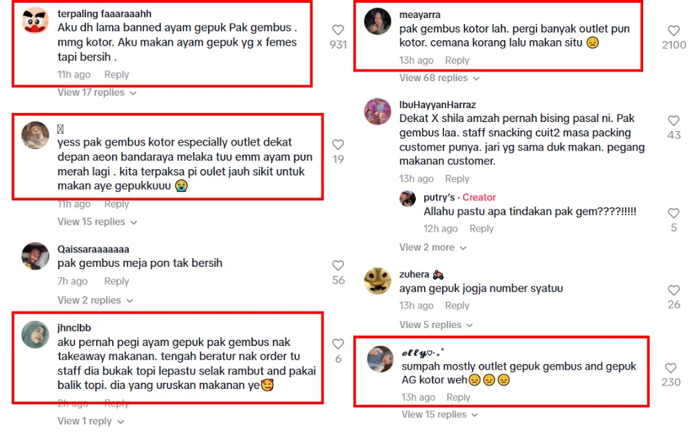 Puteri’s video has gone viral, amassing over 300,000 views on TikTok alone. Many netizens have commented on the issue, mostly grossed out by the situation. Others lamented that they’ve long stopped ordering from the brand because many outlets allegedly don’t maintain restaurant hygiene and safety. Some even shared their personal experiences with what they claim were unhygienic Pak Gembus staff and dirty premises.