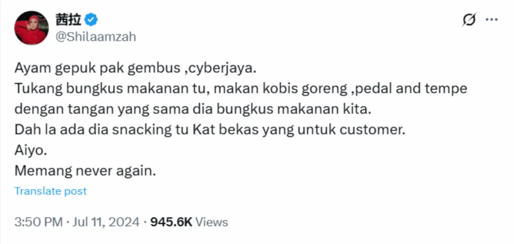 The TikTok user isn’t the only person who highlighted Pak Gembus outlets’ lack of hygiene. Last year, singer Shila Amzah exposed the chain’s Cyberjaya outlet’s employee for eating while packing an order. In her Twitter post, the star wrote, “The staff who packed the order was eating fried cabbage, chicken gizzard and tempe with the same hand he used to package our orders. And he was snacking from the food container meant for customers’ orders.”.