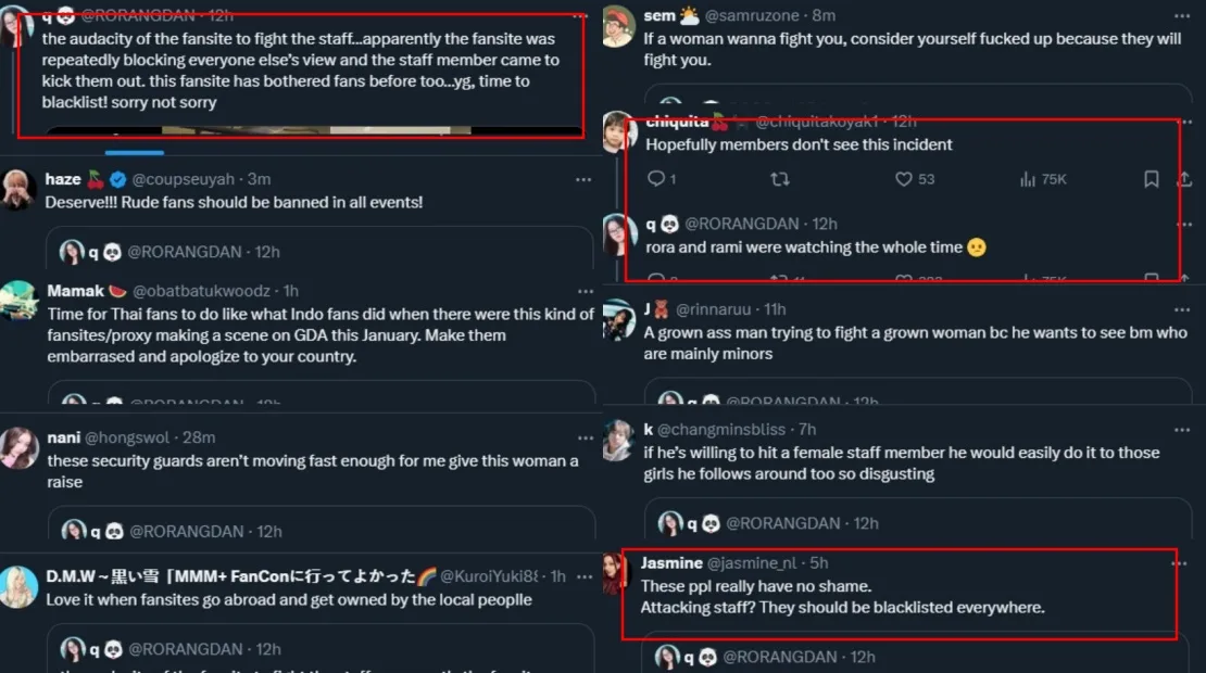 As seen in the screenshots above, a fansite can be seen attacking a staff member at the venue. Luckily, the staff was able to fend him off until security arrived and apprehended the fansite to prevent the fight from escalating further. They then escorted the fansite out of the venue. It was alleged that the staff was reprimanding the fansite after receiving multiple complaints that he was blocking the other audience members’ views.