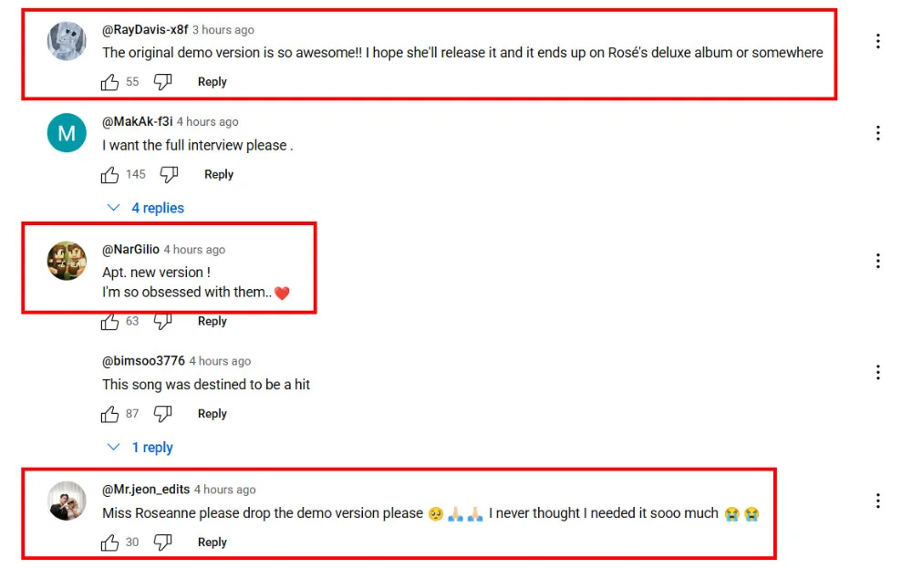 Fans have reacted to the reveal, saying that they also enjoy the original version of “APT.”. Many praised the lyrics, saying they felt more mature-sounding than the released version. Some even said they prefer the demo version to the official version with Bruno Mars. Many also urged Rosé to officially release “APT. 1.0”, either as a special single or in a deluxe version of her “Rosie” album.