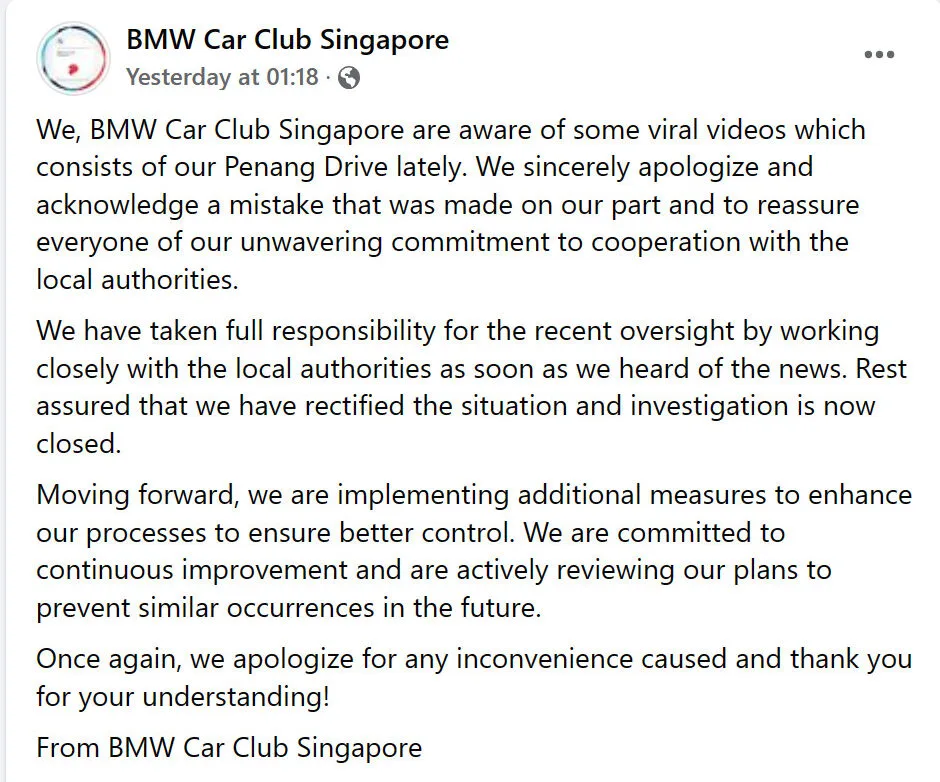After facing massive backlash, the car club has also apologised for their actions. “We, BMW Car Club Singapore are aware of some viral videos which consist of our Penang Drive lately. We sincerely apologise and acknowledge a mistake that was made on our part and to reassure everyone of our unwavering commitment to cooperate with the local authorities.”